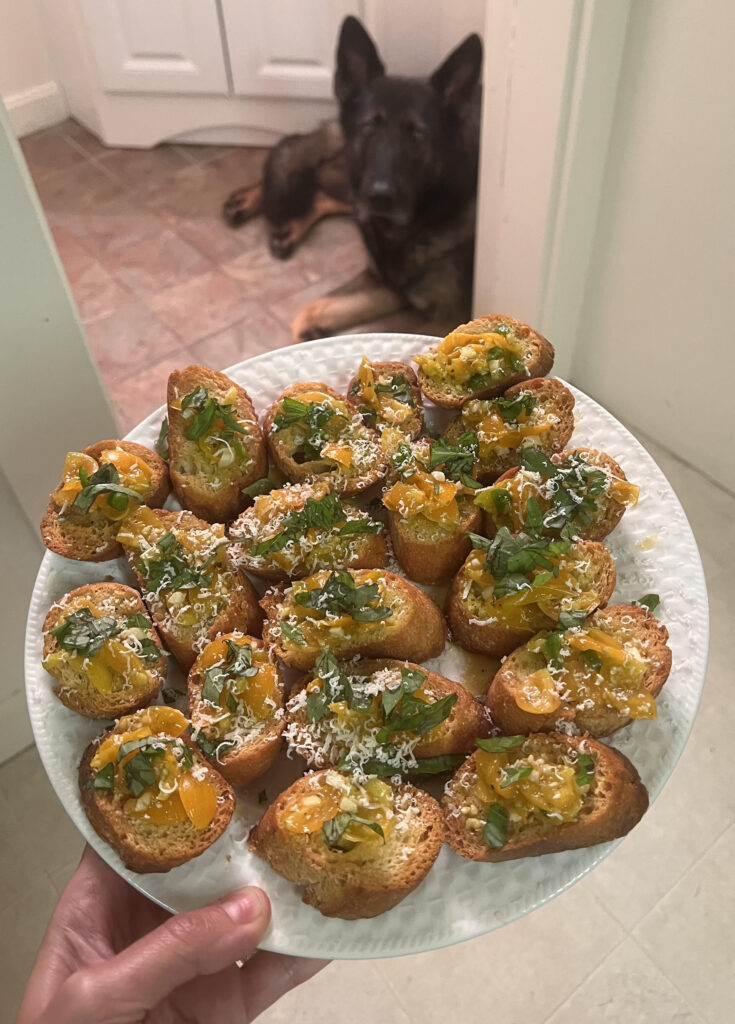 For our crostini, the Wolf and I used tomatoes, spicy peppers, and basil from the garden. She had a lot of fun helping me gather the ingredients and supervising as I cooked.